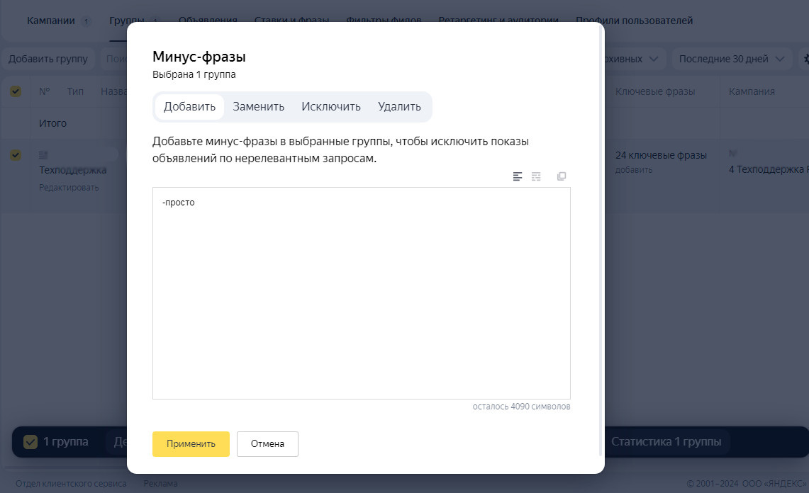 - Группировка и настройка: вы можете сгруппировать минус-слова по категориям, например, по типам товаров или услуг, и настроить их на уровне кампаний или групп объявлений.